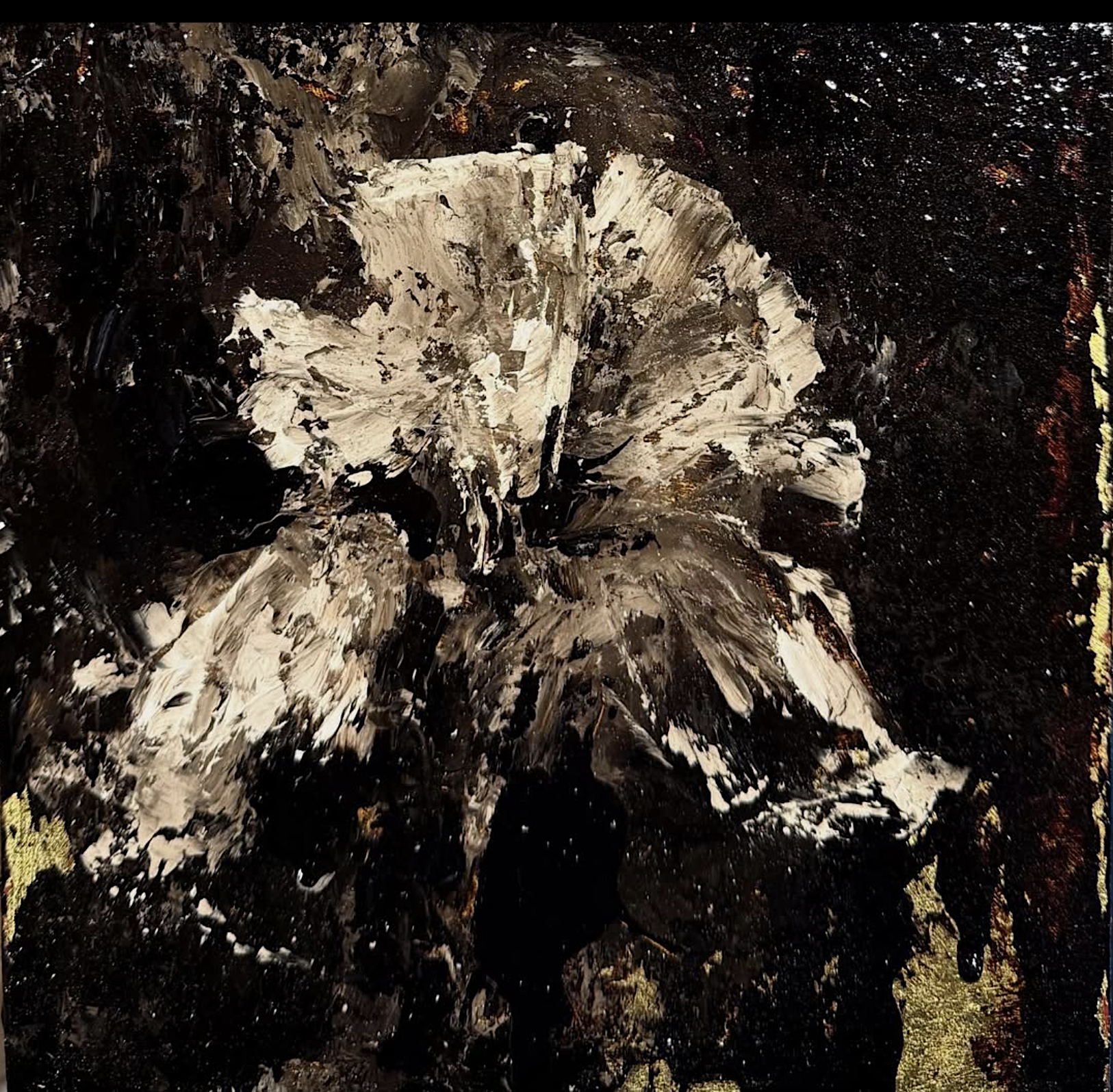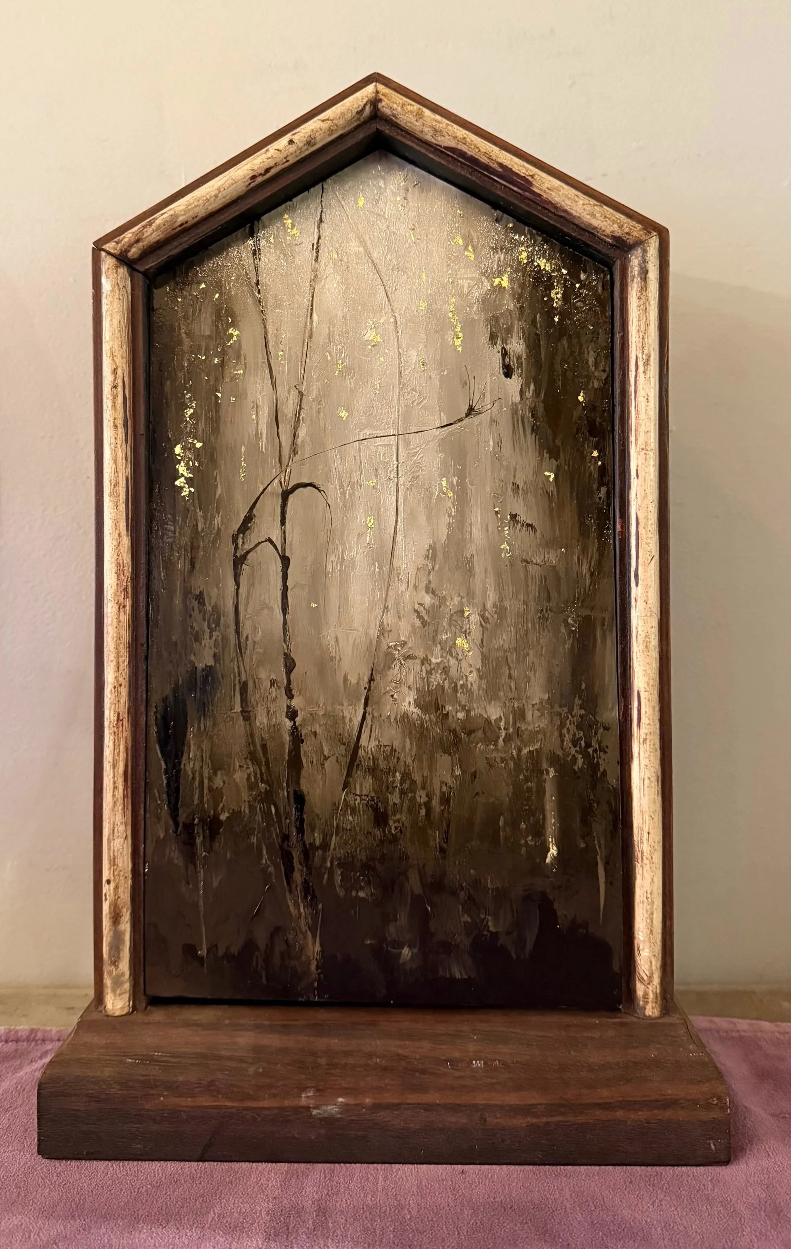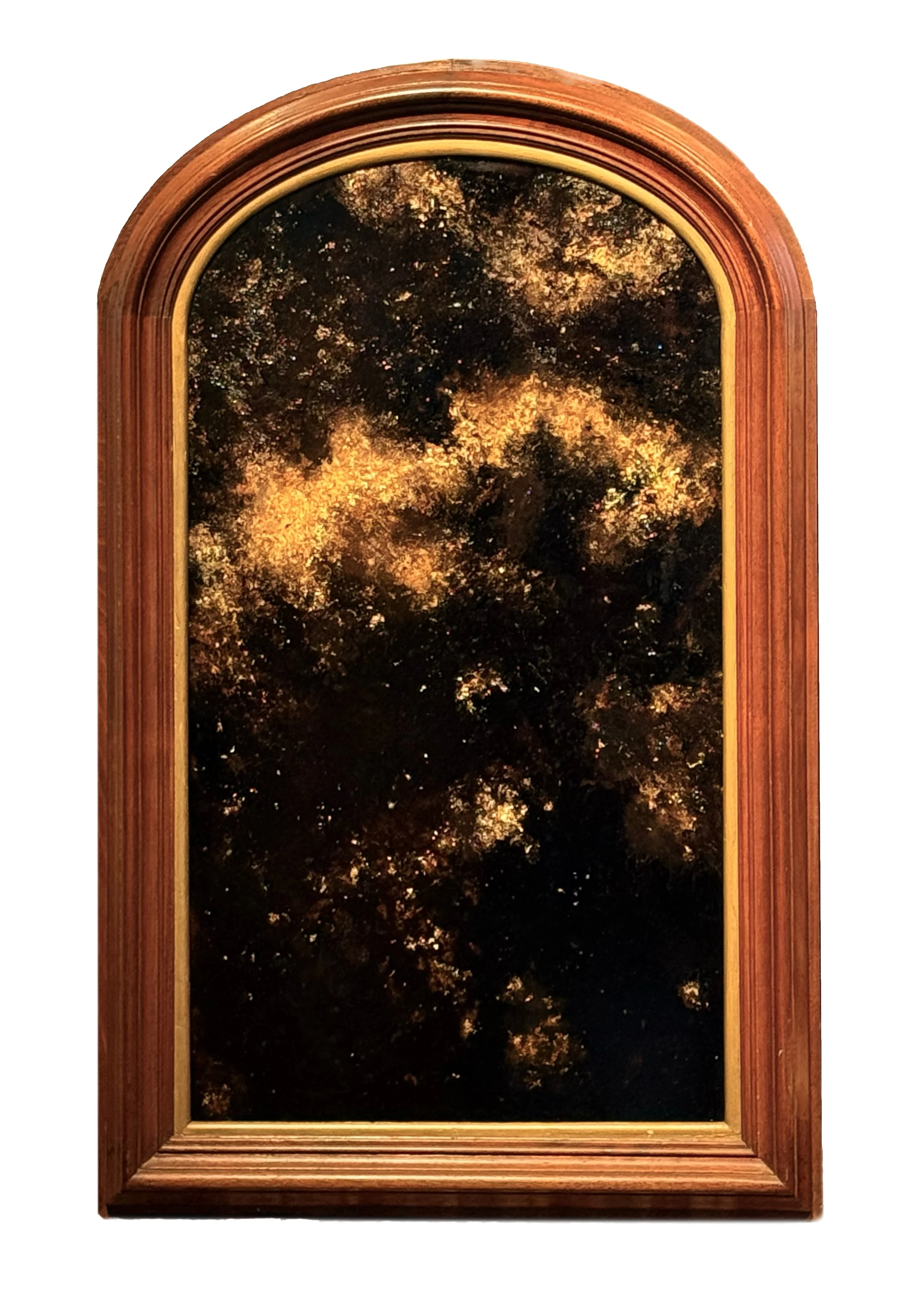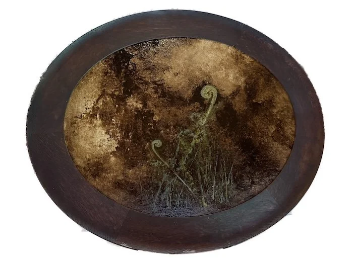 Nearly all are framed in vintage Victorian moldings that once held clock-faces, portraits, and mirrors sourced from New England attics and flea markets. Luminous natural forms emerge through a dark veil of tar and time like a hymn between worlds where beauty and decay, light, loss, and rebirth share the same breath.