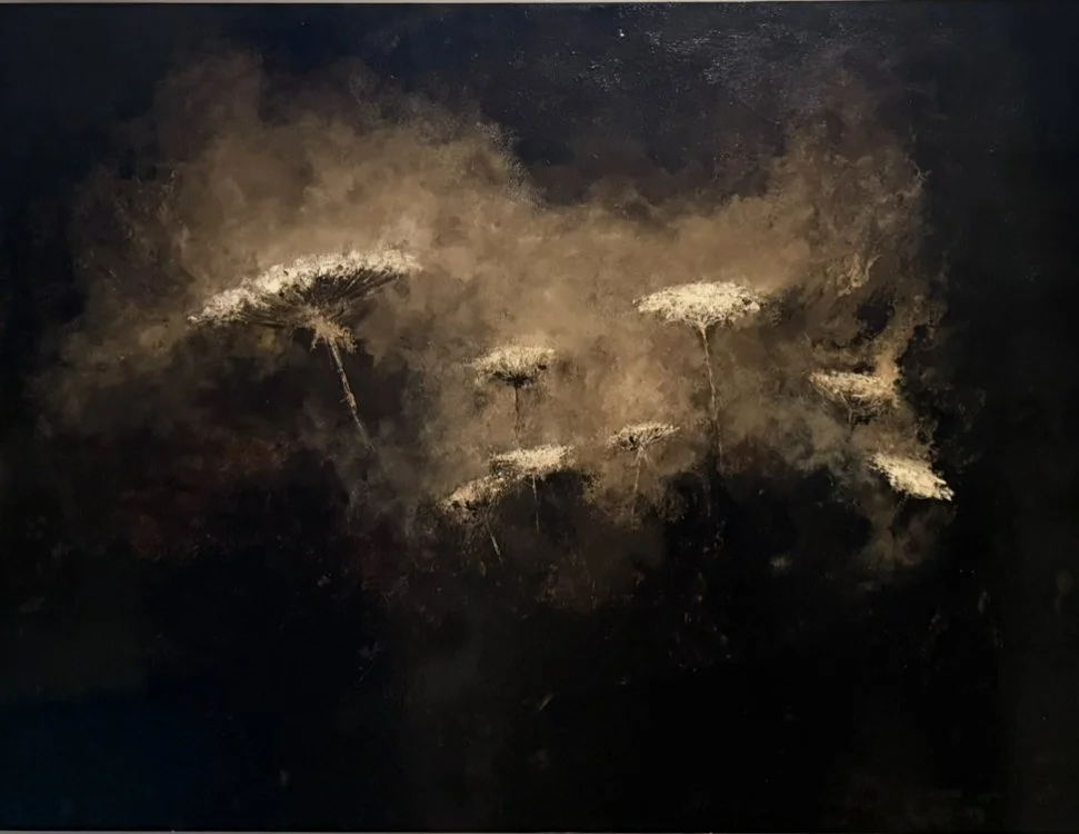 Titled with phrases from the works of Henry David Thoreau, Ralph Waldo Emerson, Margaret Fuller, Walt Whitman, and Emily Dickinson, the paintings of "In this Twilight" offer an elegiac and perhaps prophetic reminder of our lost reverence for nature amid acknowledgement of an imperiled future. Visually, the paintings suspend natural imagery in a liminal space suggestive of an “imaginal” world, one in which natural and supernatural intertwine.This series is taking shape with a residency at Harvard University’s Transcendentalism Initiative (CSWR, Harvard Divinity School). In this Twilight avoids offering hope as reassurance, nor despair as performance. The intention is to hold grief without aestheticizing catastrophe.